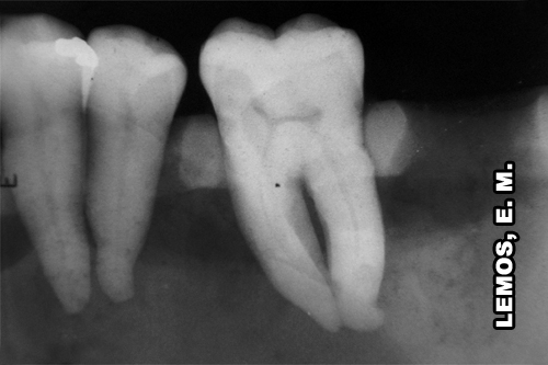 Observar o 2o. molar inferior esquerdo com a relação teto da câmara pulpar e assoalho diminuída, canais atrésicos e curvatura cervical e apical moderada, principalmente nos mesiais. |