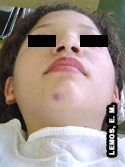 | Fístula na base da asa do nariz. Dente responsável 23, abscesso apical crônico | Fístula na base do mento. Dente responsável 41, abscesso apical crônico | |||||