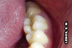 | Presença de pólipo pulpar no dente 46, clinicamente contido no interior da coroa e fácil visualização, não deixando dúvidas que não há relação com a gengiva marginal | ||||