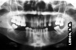 Observar radiografia panorâmica evidenciando tratamento endodôntico em todos os dentes, imagem original extraída de: Cohen, S. & Hargreaves, K. M. Caminhos da Polpa 9a. Ed. Mosby, Elsevier 2007, p59. |