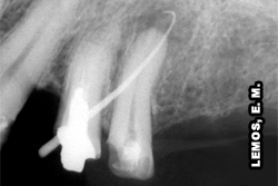 Outro recurso de fundamental importância é o traçado de fístulas, mesmo diante de dentes sem lesão aparente. Introduz-se um cone de gutapercha secundário M (médio) na fístula, com auxílio de uma pinça clínica, sob isolamento relativo, até encontrar resistência, normalmente a anestesia é dispensada. No caso em questão, observa-se que, a fístula encontra-se na altura do 1º pms e, qualquer um dos dois pré-molares podem ser o responsável. Após traçado, podemos afirmar que o responsável é o 2º pms (abscesso apical crônico), claro o 1º pms também deverá receber retratamento endodôntico. |